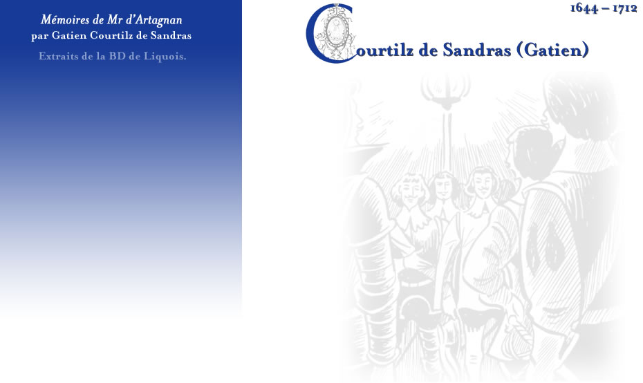 Without Sandras, Dumas would never have written The Three Musketeers . Strangely, this seventeenth century author spent most of his life in anonymity and published most of his writings illegally in Holland . And this is why so few readers have heard of him. He has been attributed works that he never wrote while never receiving credit for the ones he actually did write. He was one of those “free” authors, who lived on the margins of their epoch, and mixed different literary genres, and whose specialty was a kind of historical fiction based on fact. Critics have always given him a bad time, and the fact that he dappled outside of traditional literary venues made him an easy target. We can even read some rather virulent testimonies about him, for example: Bayle : “He is someone who wants to be read and who, to keep his readers, speaks of things as an eyewitness, though he has never left his room.” Voltaire : “ We only mention his name here to warn the French, and especially foreigners, to what point they must not put their faith in all of these fake memoirs printed in Holland . Courtilz was one of the guiltiest writers in this genre. He inundated Europe with fiction that he called history. It was shameful that a captain of the Champagne regiment should go sell his lies to the booksellers of Holland . He and his imitators, who have written such libel against their own country, against great princes who do not deign to avenge their honor and against citizens who cannot avenge theirs, have deserved the public's loathing.” Jean de Bernières: “A rather pathetic character, as it happens, venial and without shame who, when pressed, refuted his own calumnies: a disloyal soldier and rebellious subject of his prince; fled to Holland in order to defame his country in ease, sent back to France for having abused his foreign host's hospitality; always ungrateful to someone, forever a fugitive somewhere, until the Bastille, whose secrets he claimed to have divulged, finally closed its doors behind him and reduced him to a prolonged silence. It seems that one should not give credence to anything written by his pen. His desire was to excite and satisfy the basest curiosities. In making a specialty out of his apocryphal Memoirs, Sandras abased, to the point of reprehensible speculation, a literary genre that ought to be tantalizing without prevarication and sensational without being scandalous.” Not a reputable character, judging from these testimonies. But is there truth to this testimony? Who was Courtilz de Sandras? Where on the continuum between reality and fiction can we situate this man who wrote history in the form of a novel? What should we retain of his Memoirs of Monsieur d'Artagnan , who went on to be reviewed and corrected by Alexander Dumas before being transformed into the literary triumph that we know? 1. His life Gatien Courtilz de Sandras was born in 1644, probably in Paris, son of the chevalier Jean de Courtilz, seigneur of Tourly, and Lady Marie de Sandras. His was a long line of aristocrats. His parents, though certainly not very wealthy, came from a family of considerable notoriety and were able to give their son a decent education, which was to serve him later. Although he exhibited early on a certain relish for a life of letters, he would follow the path of other young men of his time: that of the army. He must have joined the army in 1660, judging from this letter where he refers to Louis XIV: “Since the age of fifteen years, I, yours truly, have not stopped serving in his armies…” Indeed, this matches the average age at which young men took up military service. His family managed to get him into the First Company of Musketeers, a sign that they must have had some connections in this reputed and coveted corps. He was therefore a musketeer in the same company that was officially commanded by the Duke of Nevers, but of which d'Artagnan was already the de facto commander. In 1667, he entered the Royal Foreign Regiment, in the cavalry with the rank of standard-bearer and he fought in the Flanders campaign, serving under Turenne. After the decommissioning of the regiment at the campaign's end, Courtilz de Sandras went back to civilian life for nearly four years. He lived in Paris and at Tourly, which belonged to his cousin, and in these two places he made acquaintances that might have served as inspiration for his future writing. In the meantime, probably in 1664, he married Marie Despied, who gave him one son and one daughter. Unfortunately, his wife died in 1671, leaving him a widower at the age of 27. In 1672, Courtilz went to war again and was given command of a company in the regiment of Beaupré-Choisieuil as captain of cavalry. We don't know if he participated in the war against Holland , but he was certainly involved in military operations in Catalonia in 1675, then in Alsace and, finally, in Roussillon . His military career ended in 1679, probably during the dissolution of a number of companies that occurred in that same year. He was 35 years old at the time. “He had already been preparing, for some time, what one could call his re-adaptation to civilian life: he had married and, through a few publications, he had entered into a literary career.” Jean Lombard. Indeed, in 1678, he married Louise Panetier, a fairly wealthy bourgeoise. As he was in debt, this seems to have improved his financial situation. We don't know if this same need for money is what pushed him to write, but his first four books were all published during this same time period. The titles published were: An Account of Events in Catalonia , Stories of Love and Gallantry, New Anthology of Letters and Courtly Letters with Their Responses on Various Subjects and Account of Events in Flanders and Germany . Courtilz published these works officially and with the support of Monsieur de Bezons, a counselor of State. Then, he decided to devote himself to adventure novels, but in a clandestine way