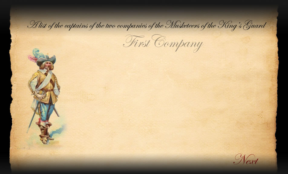 I. Jean de Bérard, chevalier, Marquis of Montalet, in 1622 (creation of the company). II. Hercule-Louis de Bérard de Montalet Vestric, , the former’s nephew, 1627. He was mortally wounded at Castelnaudary in 1632. III. Jean de Vieilchastel, lord of Montalet, of Saint-Hilaire, of Frety, of Mardilly, of Savigny, etc, master (mâitre d’hôtel) of the king’s house and gentleman of his chambers, appointed in 1632. He resigned in October 1634 and was made governor of the Duchy of Bar. IV. Jean Arnaud du Peyrer, alias Armand-Jean de Peyré, count of Troisvilles (better known as the Count of Tréville), 1634-1646 (dissolution of the first company). V. Philippe Julien Mancini Mazarin, Duke of Nevers and Donzy, chevalier of the King’s Orders, governor-general of Nivernais province, lieutenant-captain if the 1st company from 1657 to 1667, when he resigned in favor of Monsieur d’Artagnan. VI. Charles de Batz Castelmore, Count d’Artagnan, 1667-1673. In two roles in the 1st company, from 10th August and 19th November 1668, which begins: “The King, captain, Charles of Castelmore, the Seigneur d’Artagnan, lieutenant, the Seigneur de la Rivière, sub-lieutenant, Seigneur de Jauvelle, ensign, Seigneur de Maupertuis, standard-bearer”. We remark, among the musketeers: Seigneur de Saint-Martin, Seigneur de la Plagne, Seigneur de Vignolles, Seigneur d’Artagnan, Seigneur de Labadie, Seigneur de Sainte-Colombe, another Seigneur de la Plagne, Seigneur de Lavardac, Seigneur des Bordes, etc., all kinsmen or allies of d’Artagnan or fellow Gascons. VII. Louis de Forbin, called the bailiff Forbin, was major of the king’s body guard when the king named him lieutenant-captain of the 1st company. He was also general-lieutenant of the king’s armies. He died in 1684. VIII. Louis de Melun, Marquis of Maupertuis, cavalry captain, admitted into the musketeers as chief sergeant, 7th November 1661. He was successively standard-bearer, ensign and sub-lieutenant of the 1st company, camp master in 1674, corporal of the king’s armies in 1678, lieutenant-captain of the 1st company of musketeers the 13th May 1684, governor of Saint Quentin in 1686, camp sergeant in 1693, Grand Cross of Saint Louis in 1706. He resigned as lieutenant-captain in 1716 and died 18th May 1721. IX. Joseph de Montesquiou, Count d’Artagnan, lieutenant-captain of the 1st company by commission 18th February 1716, had already been general-lieutenant since 23rd December 1702. He became chevalier of the Orders on 3rd June 1727. The king had him don the [musketeer’s] tunic in 1668. In 1673, he participated in the assault on the demilune, in which his cousin Charles de Batz d’Artagnan was killed. In 1684, the king made him standard-bearer of the musketeers, with the rank of camp master in the light cavalry, for a commission of 45,000 pounds. X. Louis de Bannes, Count of Avejan, was captain of the French Guards when he bought the commission of sub-lieutenant in the 1st company on 1st April 1716. Named lieutenant-captain the 4th January 1729, upon the death of d’Artagnan, he was also general-lieutenant of the king’s armies. XI. Pierre-Joseph Chapelle, Marquis of Jumilhac, sub-lieutenant of the 1st company, succeeded the Count of Avejan in 1736 and was general-lieutenant and governor of Philippeville. XII. François de Portalès, then Count of Chèze, lieutenant of grenadiers in the French Guards, was named second standard-bearer of the 1st company of musketeers the 10th May 1741, with the rank of camp master, corporal of the king’s armies the 20th March 1747, first cornette the 5th May 1750, second ensign the 8th October 1751, first ensign the 7th July 1754, second sub-lieutenant the 13th June 1756, camp sergeant the 1st February 1759, first sub-lieutenant the following 7th October and general-lieutenant the 25th July 1762. He was lieutenant-captain at the time of the dissolution of the musketeers in 1776. |