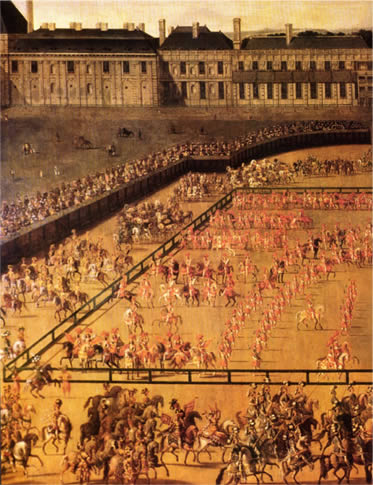 “The inauguration of the Count of Maulévrier as lieutenant-captain took place with great solemnity. Immobile and in battle ranks, the six hundred Musketeers of the King awaited the King and his courtesans. The black musketeers donned for the first time their new tunics for the occasion and were impeccably aligned. Each man held his musket against his right leg. In his other had, gloved in buffalo fur, he restrained his quivering mount—not without difficulty, as the muskets’ fuses, affixed to the horses’ hoods between the ears, vexed the mounts. Twenty musicians, attired in long, azure blue coats, were lined up rigidly in front of the companies. There were twelve drummers and eight oboists. It was the first time they would play without fifes or trumpets the already famous march of the Grand Musketeers, as the King had ordered (…) His attitude severe, Louis XIV reviewed the squadrons, then positioned himself at the center of the courtyard. On his order, Maulévrier took the lead of the first company and filed past, followed by all the Musketeers as one man. Then, he commanded alone the brigades’ skilled maneuvers. The long lines of cavalry intertwined and twirled endlessly in a dazzling carrousel.”