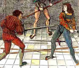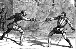 C'est aussi l'époque de la publication des fameux traités d'escrime dus aux meilleurs maîtres d'armes des écoles française et italienne. Et c'est dans ce creuset de scandales et d'intrigues que naît la fine fleur des duellistes, les « belles épées » et les « fines lames », que l'on voit à l'œuvre dans des rencontres sanglantes. C'est l'époque des duels terribles, à outrance, qui voient les ferrailleurs les plus en vue, tels Bussy d'Amboise, de Mouÿ, Châteauvillain, Vitaux, le chevalier de Guise, risquer leur vie, comme à plaisir, pour les causes les plus futiles. »