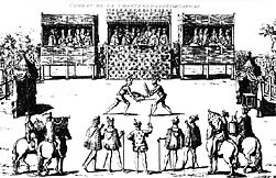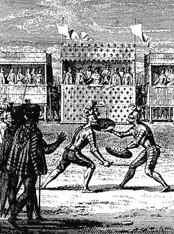 « C'est au cœur de l'Europe, en Germanie, que le duel prit naissance. C'est là qu'on en rencontre les premières traces. Les Germains, qui n'avaient jamais été subjugués, jouissaient, dit Montesquieu, d'une indépendance extrême ; les familles se faisaient la guerre pour venger des meurtres, des vols, des injures. On modifia cette coutume en astreignant la guerre à des règles. Elle se fit par ordre du magistrat, ce qui était préférable à une licence générale de se nuire (…) En envahissant les Gaules les Germains y implantèrent le duel judiciaire. Ce combat avait lieu dans un champ clos, autour duquel était tendue une corde qui tenait la foule en respect (…) Celui des deux combattants qui avait provoqué l'autre lui jetait un gant que ce dernier ramassait pour indiquer qu'il acceptait le défi. Ils faisaient choix d'un ou de plusieurs parrains, lesquels, dans le principe, étaient de simples témoins, mais qui plus tard durent descendre dans la lice pour soutenir leurs filleuls ou venger leur mort (…) Le combat terminé, le vainqueur se rendait à l'église pour rendre grâce à Dieu, et souvent y suspendait, en guise d'ex-voto, les dépouilles du vaincu. » Grand Larousse universel du XIXe siècle