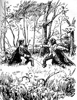 Le duel est un combat singulier, assigné d'homme à homme et soumis à certains codes. En règle générale, ces deux adversaires s'affrontent par les armes quand l'un a demandé à l'autre réparation d'une offense ou d'un tort. Le mot vient du latin duellum qui, selon les encyclopédies, serait soit la forme ancienne de bellum = guerre, soit celle de duo = deux. Ce pourrait d'ailleurs être un mélange de ces deux significations, car il s'agissait bien d'une forme de guerre entre deux individus. La signification et les règles du duel ont changé au fil des temps ; l'évolution des armes et le rapport au pouvoir royal et juridique ont modifié, en France, la loi et les conventions qui régissent les duels. |