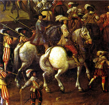 « Richelieu put vérifier l’excellence de son choix dès l’année suivante. Le roi d’Espagne et le duc de Savoie revendiquaient le marquisat de Montferrat et avaient entrepris le siège de Casal. Tout à la joie de la capture de la Rochelle, le Conseil du Roi sut convaincre Louis XIII de ne pas compromettre son prestige en abandonnant le Prince Charles de Gonzague, son allié. Le 15 janvier 1629, entouré de ses Gardes et suivi des Mousquetaires, il quitte Paris pour la Savoie. Le Cardinal et un état major imposant sont du voyage. » Arnaud Jacomet. |